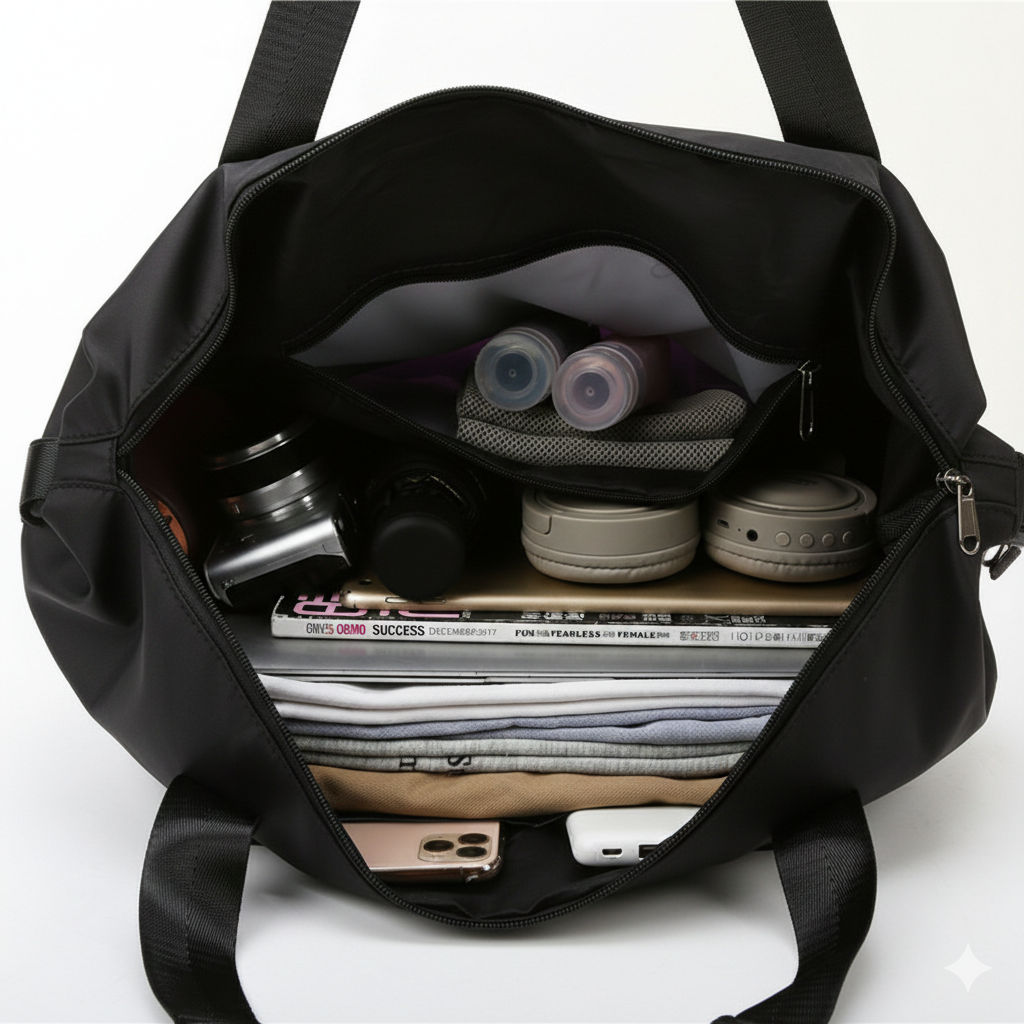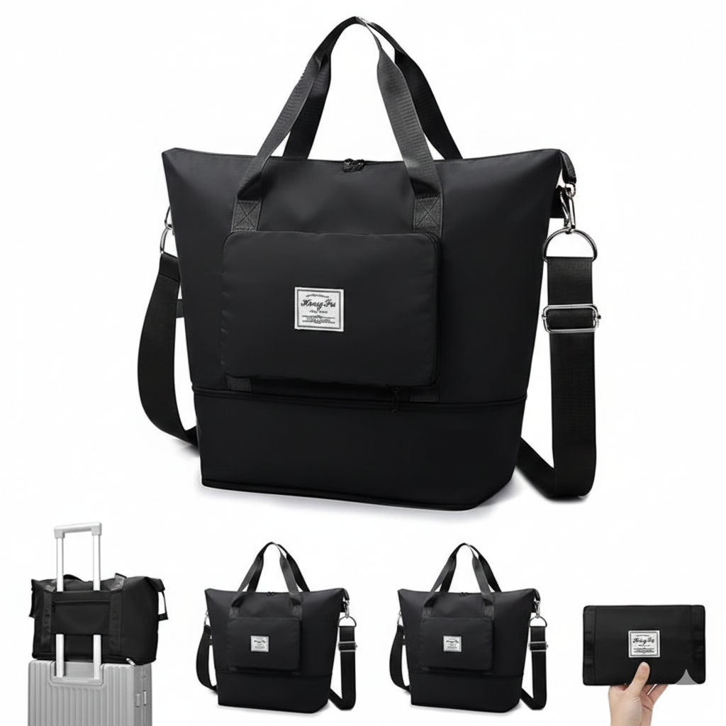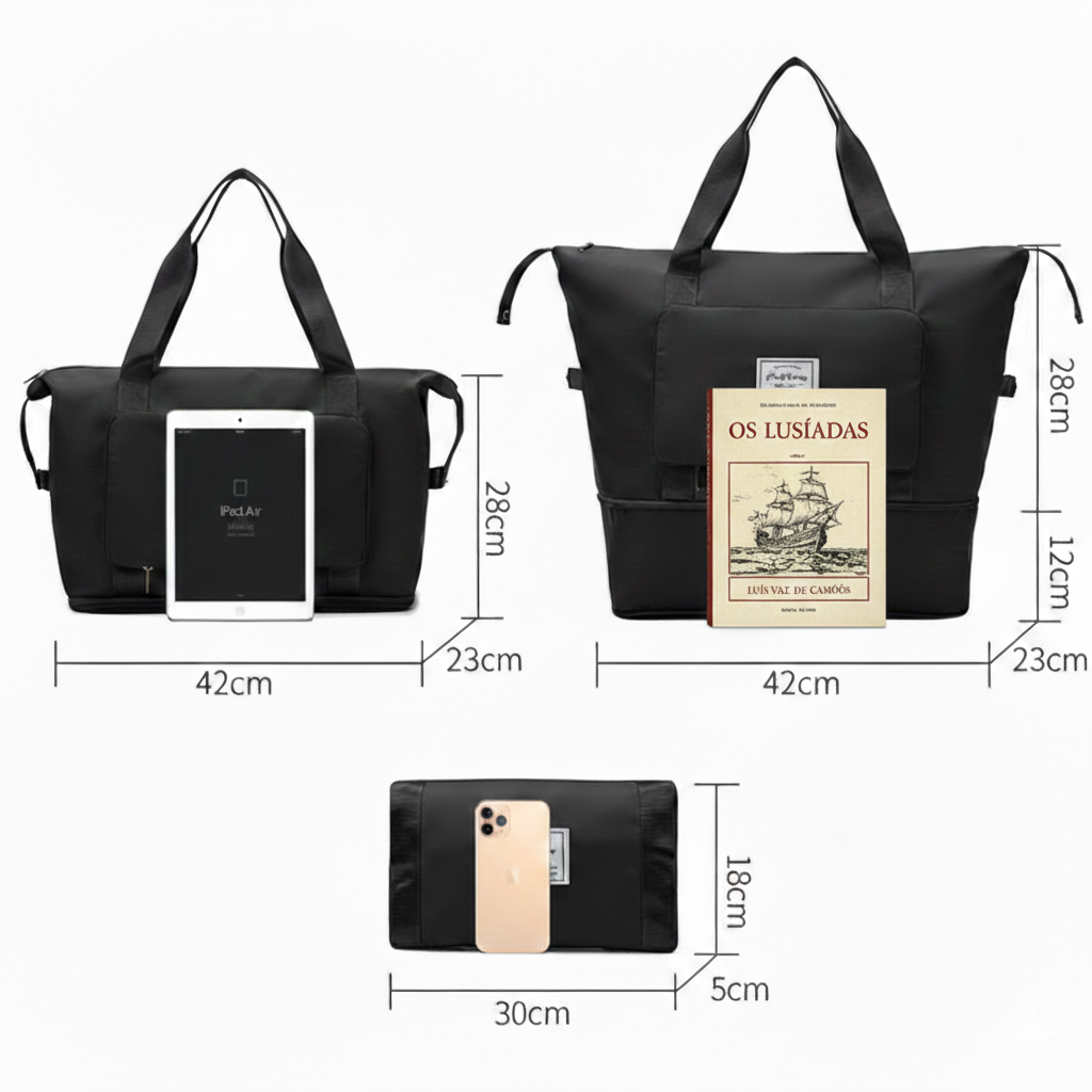 Mais espaço, sem perder a forma. Expande até +40% para levar sapatos, toalhas ou roupa extra. Depois, dobra‑se em segundos e volta ao tamanho original — sem complicações.